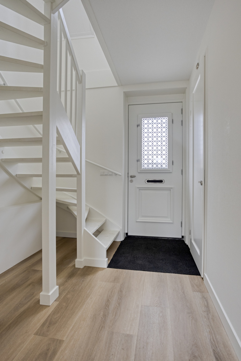 Begane grond: Bij binnenkomst betreed je een ruime hal met meterkast, toilet, de trapopgang naar de verdieping en toegang tot de woonkamer en keuken. De woonkamer, met een royaal vloeroppervlak is opvallend licht dankzij de grote raampartijen. Via dubbele tuindeuren is de tuin bereikbaar. De keuken met inbouwapparatuur bevindt zich aan de voorzijde van de woning. Vanuit de woonkamer is er toegang tot een slaapkamer en een volledig betegelde badkamer, uitgerust met een douche, wastafel en toilet. Aangrenzend aan de keuken bevindt zich de praktische bijkeuken, met een buitendeur naar de voorzijde van de woning.