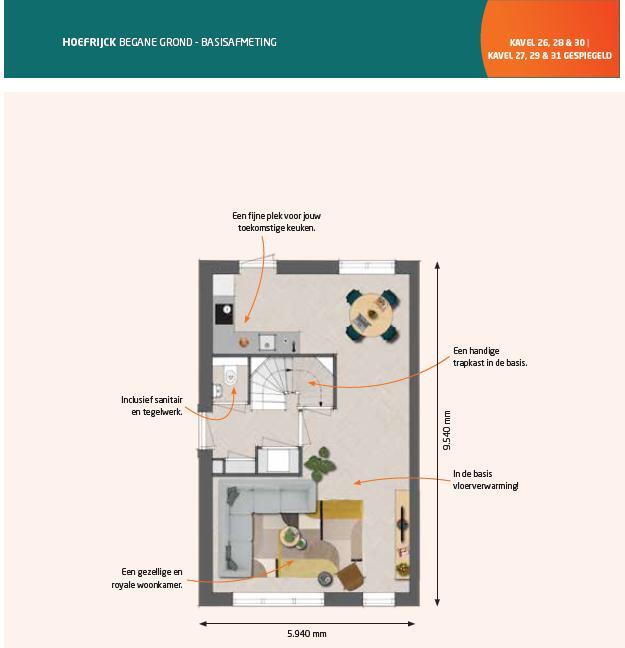 Het woning model Hoefrijck is een ideale woning met een ruim aantal mogelijkheden. De woning heeft een woonoppervlakte van 119 vierkante meter en is daarmee 5,94 meter breed en 9,54 meter diep. Aan de voorzijde van de woning is ruimte voor een fijne zithoek en aan de tuinzijde is de perfecte plek voor een nieuwe keuken.