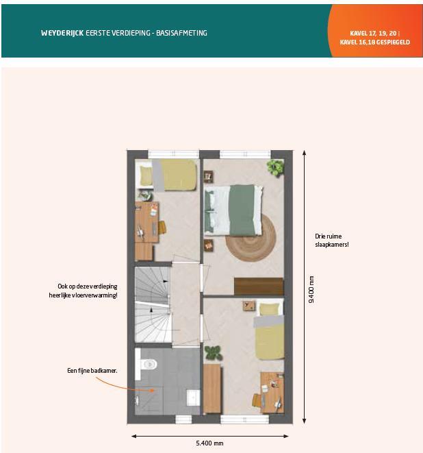 Woningmodel Weyderijck is dé perfecte eengezinswoning. De woning is 5,40 meter breed en 9,40 meter diep. Een ideale ruimte dus om mooi in te delen. De voorzijde biedt ruimte voor een mooie keuken en de tuinzijde is perfect voor het inrichten van een fijne zithoek.