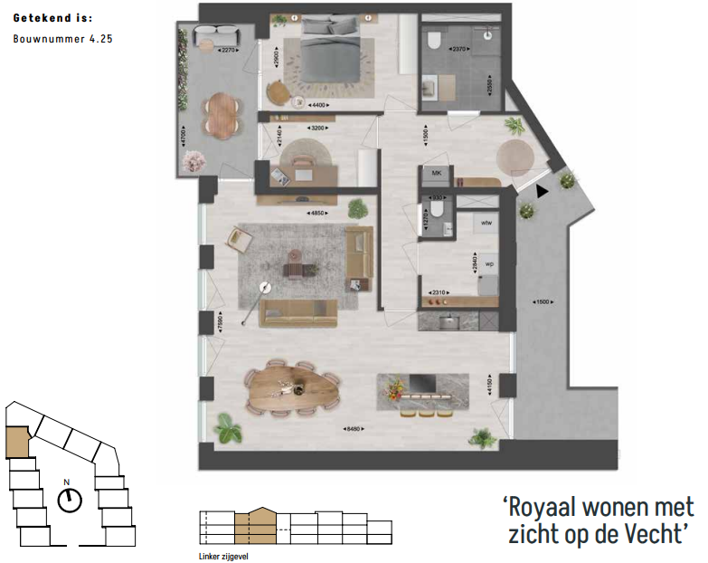 Deze online presentatie en eventuele bijlagen zijn samengesteld op basis van de ons bekende gegevens en afbeeldingen. Samen met de artist impressies geven ze een indruk van de toekomstige situatie. Ze pretenderen geen exacte weergave te zijn van het uiteindelijke product. Rechten kunnen dan ook niet aan deze presentatie of bijlagen worden ontleend. Eventueel genoemde of getoonde afmetingen zijn indicatief.