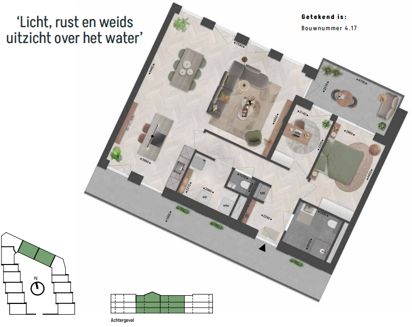 Ruim wonen aan de Vecht De appartementen van type A06 liggen allemaal aan de Vechtzijde. Ze bieden een prachtig uitzicht over het water en het groen langs de oever. De ruime woonkamer met open keuken vormt het hart van de woning en laat dankzij de grote raampartijen veel licht binnen. Verder zijn er twee ruime slaapkamers, een royale badkamer en een technische ruimte met aansluitingen voor wasmachine en droger. Een praktische, eigen berging bevindt zich op de begane grond. Het half-inpandige terras of balkon is groot genoeg voor een fijne zitplek of eettafel en vormt een heerlijke verlenging van de woonkamer. Hier woon je comfortabel en energiezuinig, met het rustgevende rivierlandschap elke dag als decor.