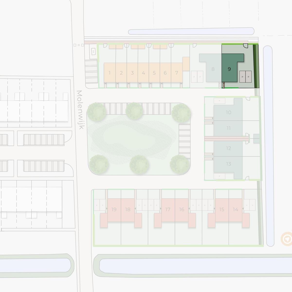 De wijk met 19 koopwoningen heeft een speelse opzet en sluit naadloos aan op de bestaande buurt. De woningen hebben een warme, tijdloze uitstraling door de combinatie van metselwerk en hout.