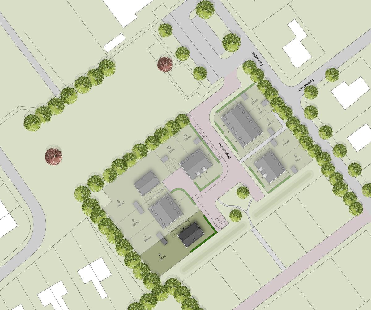 In Vledderveen worden aan de doodlopende straat Westerslag 11 unieke woningen gerealiseerd. Het nieuwbouwplan bestaat uit twee vrijstaande woningen, zes twee-onder-een-kap woningen en drie rijwoningen. De woningen kijken allemaal uit op het groenrijke plein in het midden van het plan.