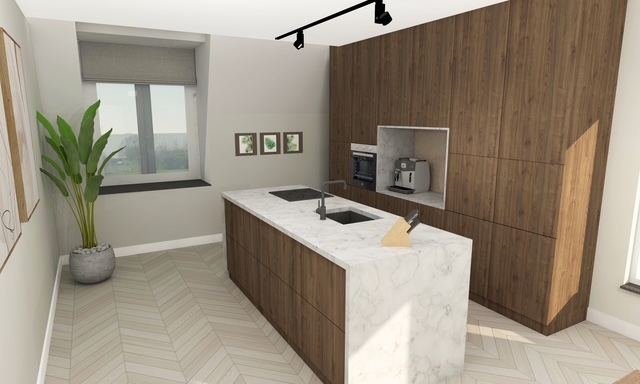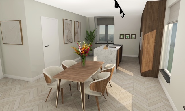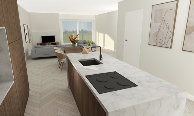 In het midden van de woning ligt de woonkamer. Hier valt meteen op hoe veel daglicht binnenkomt door de grote ramen. De open keuken sluit logisch aan op de leefruimte, waardoor de kamer een prettig geheel vormt. Via de schuifpui loop je door naar het balkon op het zuiden, waar je de hele dag door in de zon kunt zitten.
